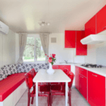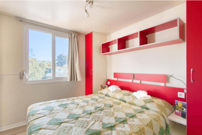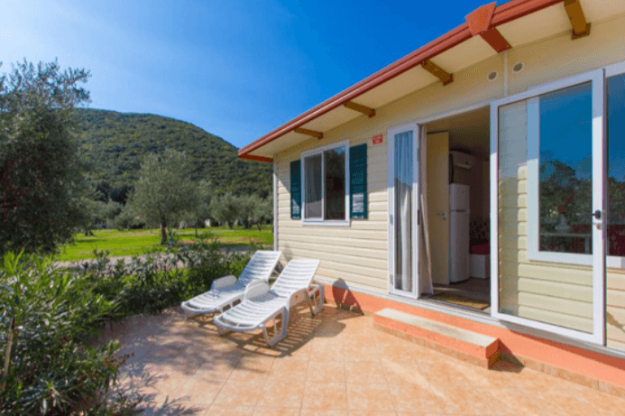 Mobilna hiška pribl. 32 m2 ima 2 spalnici (ena z zakonsko posteljo, druga z ločenima ležiščema), dve kopalnici(prha, WC), dnevni prostor z raztegljivim kavčem, klimatsko napravo, SAT-TV, kuhinjsko nišo in teraso.