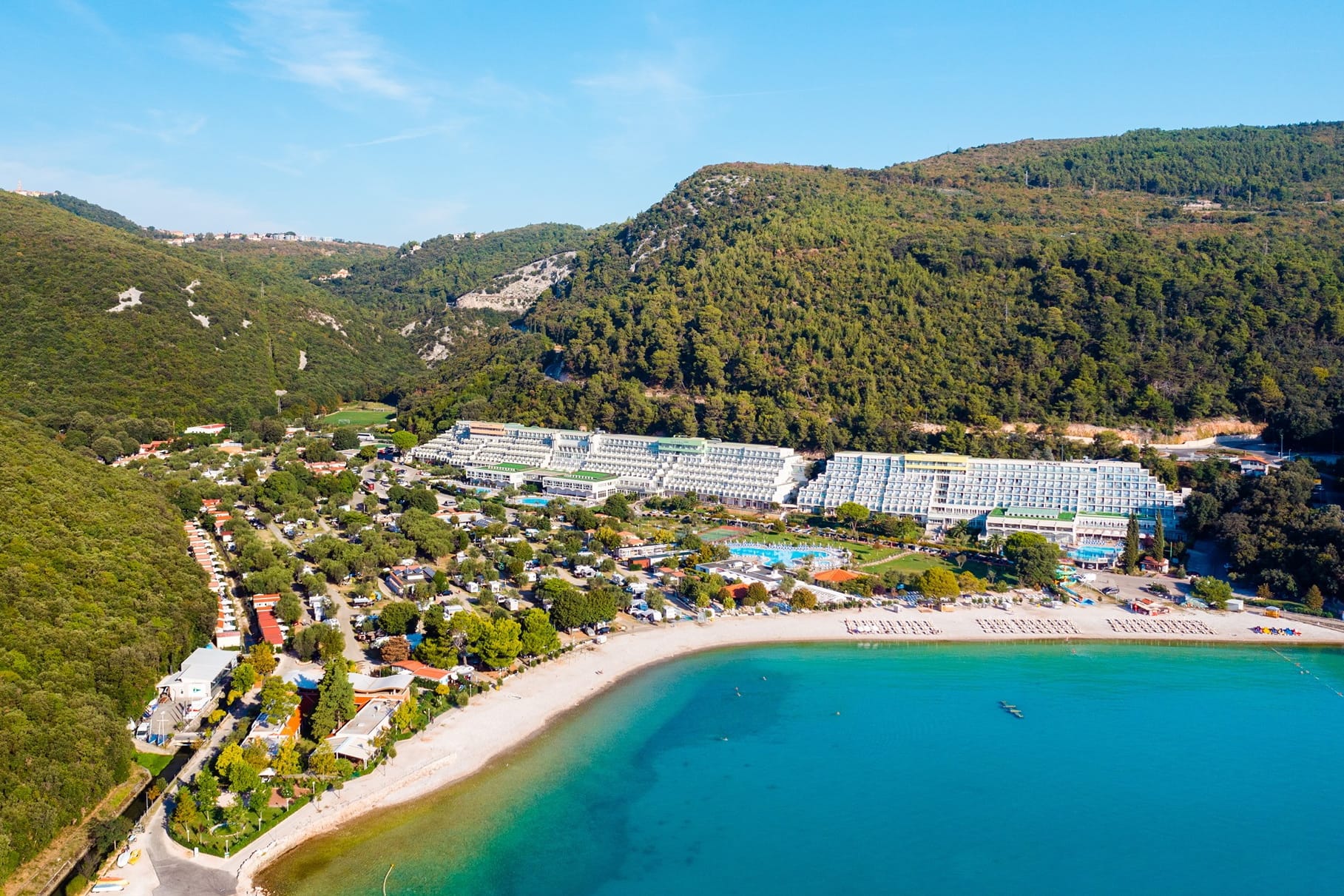 Brezplačno privatno parkirišče je na voljo pri mobilni hiški ali ob hotelu. Hišice v coni 3 so od plaže oddaljene 350-700 m. Plaža je prodnata, primerna za otroke, ležalnike in senčnike si lahko izposodite za doplačilo. Do centra